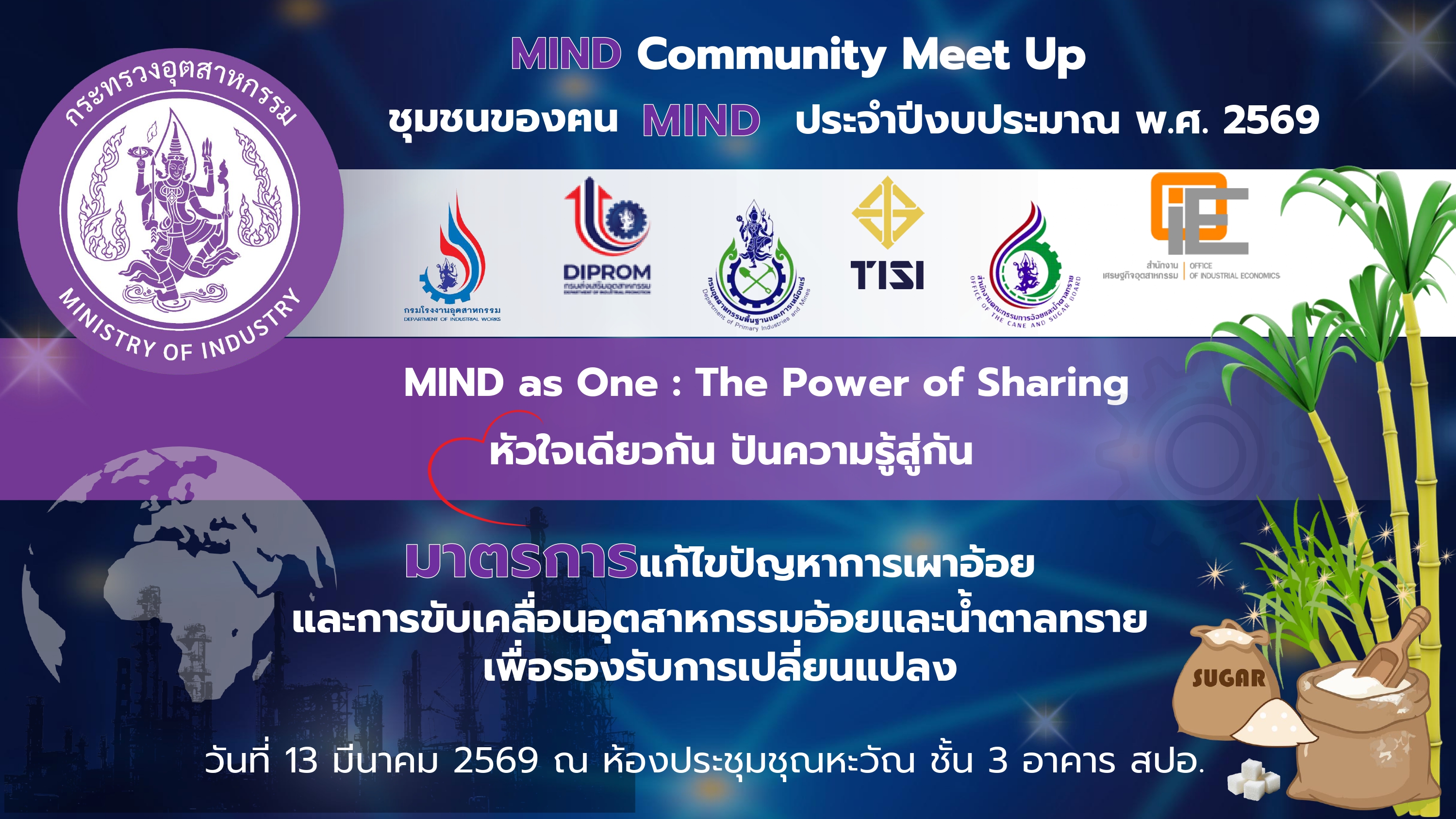 (เมื่อวันที่ 13 มีนาคม 2569) กลุ่มพัฒนาระบบบริหาร สำนักงานปลัดกระทรวงอุตสาหกรรม ได้จัดกิจกรรม MIND Community Meet Up 'ชุมชนของคน MIND' ประจำปีงบประมาณ พ.ศ. 2569 ในแนวคิด "MIND as One : The Power of Sharing (หัวใจเดียวกัน ปันความรู้สู่กัน) " ครั้งที่ 1